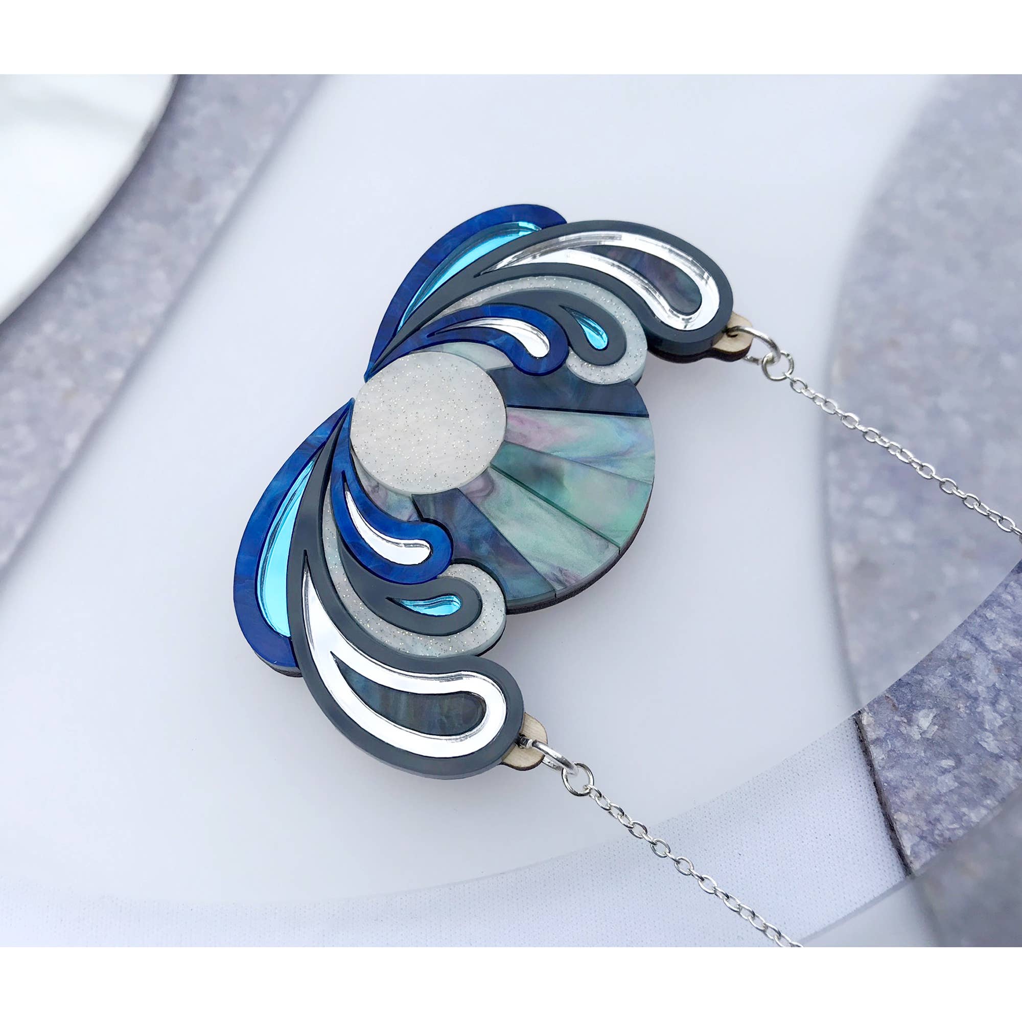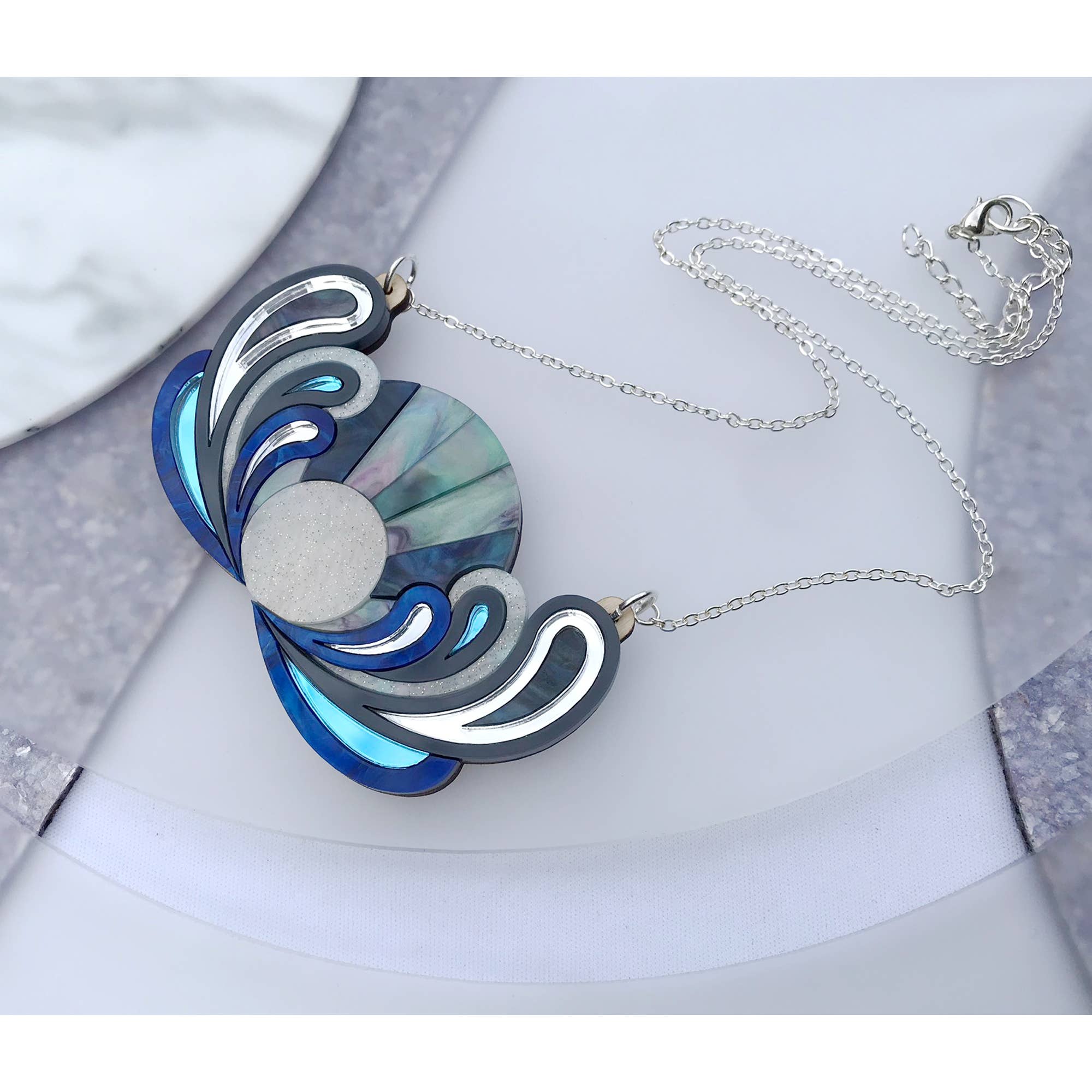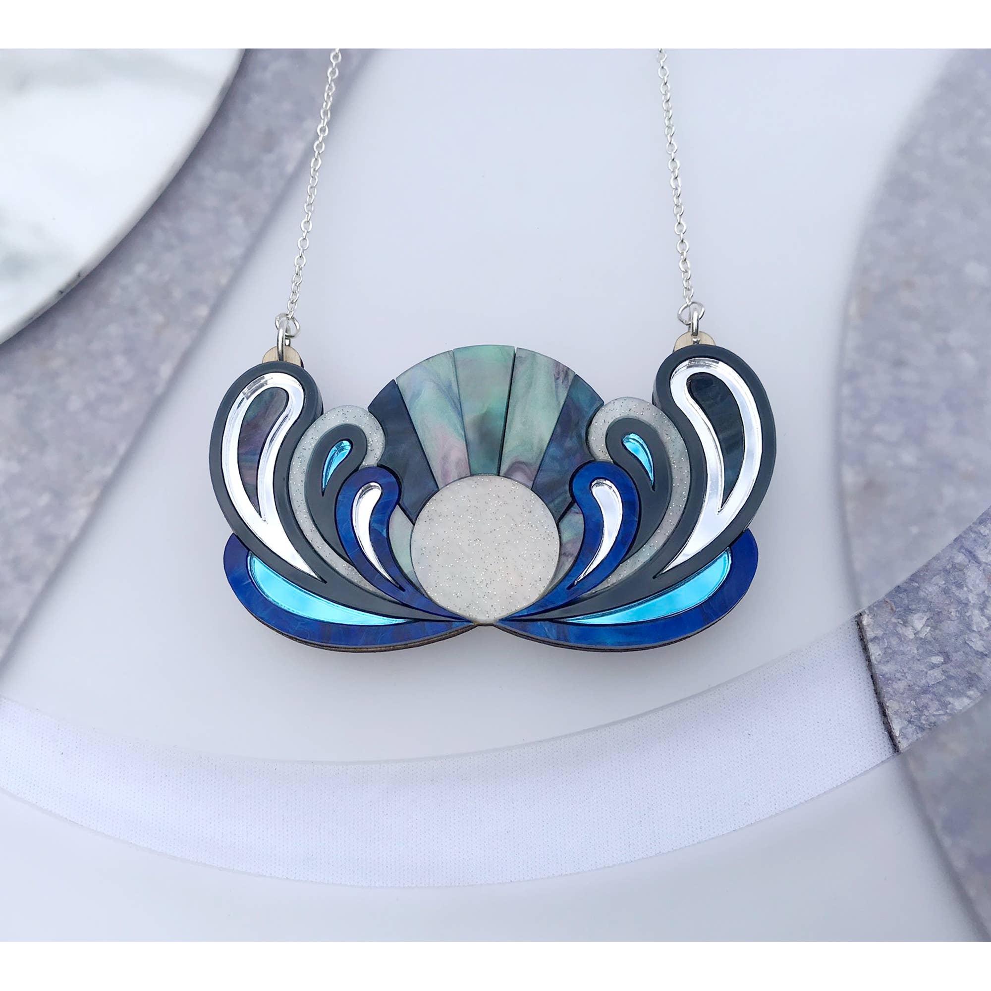 Laser-cut acrylic bib necklace featuring a layered "sunrise" design in mixed colours and finishes, including marbled and mirror acrylics. All pieces are hand-assembled on a laser-cut wood base for a lightweight yet durable structure. Necklace is finished with a silver-plated chain: 20cm length on each side, plus a 5cm extender for adjustable fit. Approx. bib necklace size: 8.4cm x 4.9cm at furthest points. The Lunar colourway features marbled blues and purples, with midnight marble, dark grey and blue and silver mirror. Please note: due to the handmade nature of marbled acrylic, colour distribution may vary slightly between pieces.