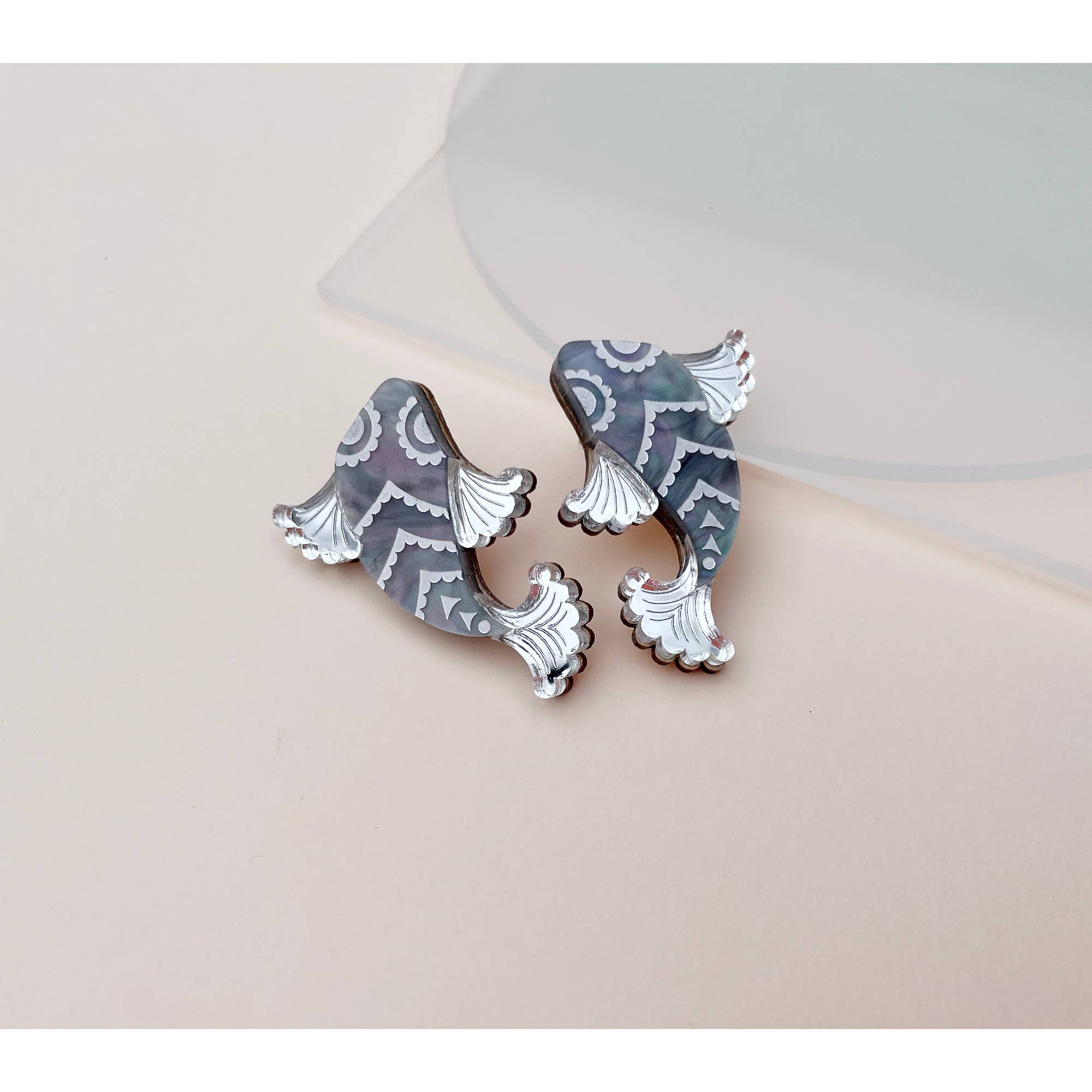 A bestselling style, these statement stud earrings are inspired by elegant Koi Fish and are available in gold and pearl marble or silver and blue marble. The design is laser-etched and cut from mirror and marbled acrylic. The etched pattern is then hand-inked to highlight the delicate detailing. The earring studs are made from surgical steel, ideal for sensitive ears, and are presented on a custom made arch-shaped earring card. Please note the marbled acrylic used in this design can vary from the photos, there will be areas of lighter and darker marbling in each design. The studs measure 1.5cm x 2.5cm, with the stud post placed at the top of the earring.